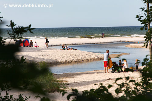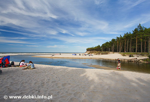 Za sprawą plaży nudystów, plaża w Dębkach jest najpewniej najbardziej znaną plażą w Polsce – przynajmniej ze słyszenia. To bardzo szeroka, o jasnym, drobnym piasku plaża. Od zabudowań Dębek idzie się na nią około pięciu minut przez las. Plażę odgradzają niewysokie wydmy, więc same zejścia na plażę są łagodne. Przez zachodnią część plaży uchodzi do morza rzeczka Piaśnica, co jakiś czas zmienia ona swoje ujście – i jeśli ktoś będzie odwiedzał Dębki co roku – za każdym razem ujście będzie wyglądało inaczej. Latem na plaży działa szkółka windsurfingowa.